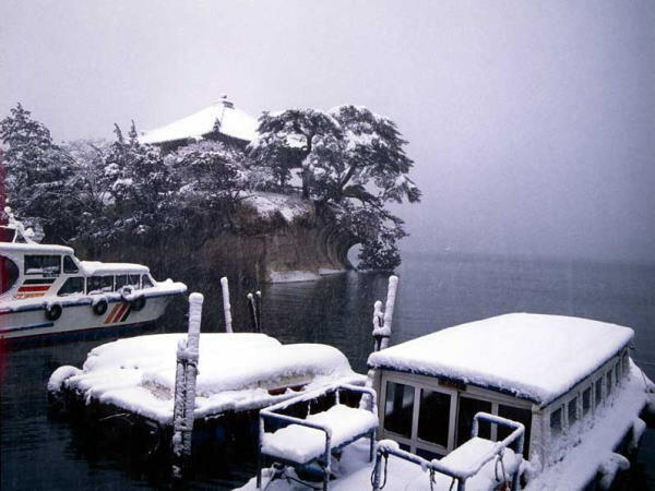 藩政時代政宗によって建立された松島のシンボル国宝五大堂。厳冬の朝の姿もまた違った風情がある。